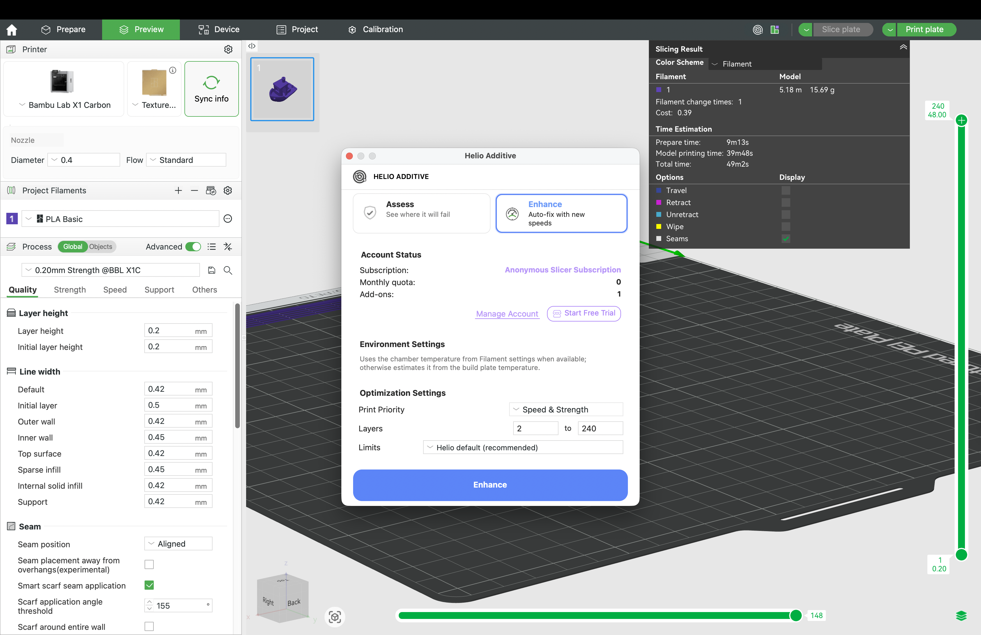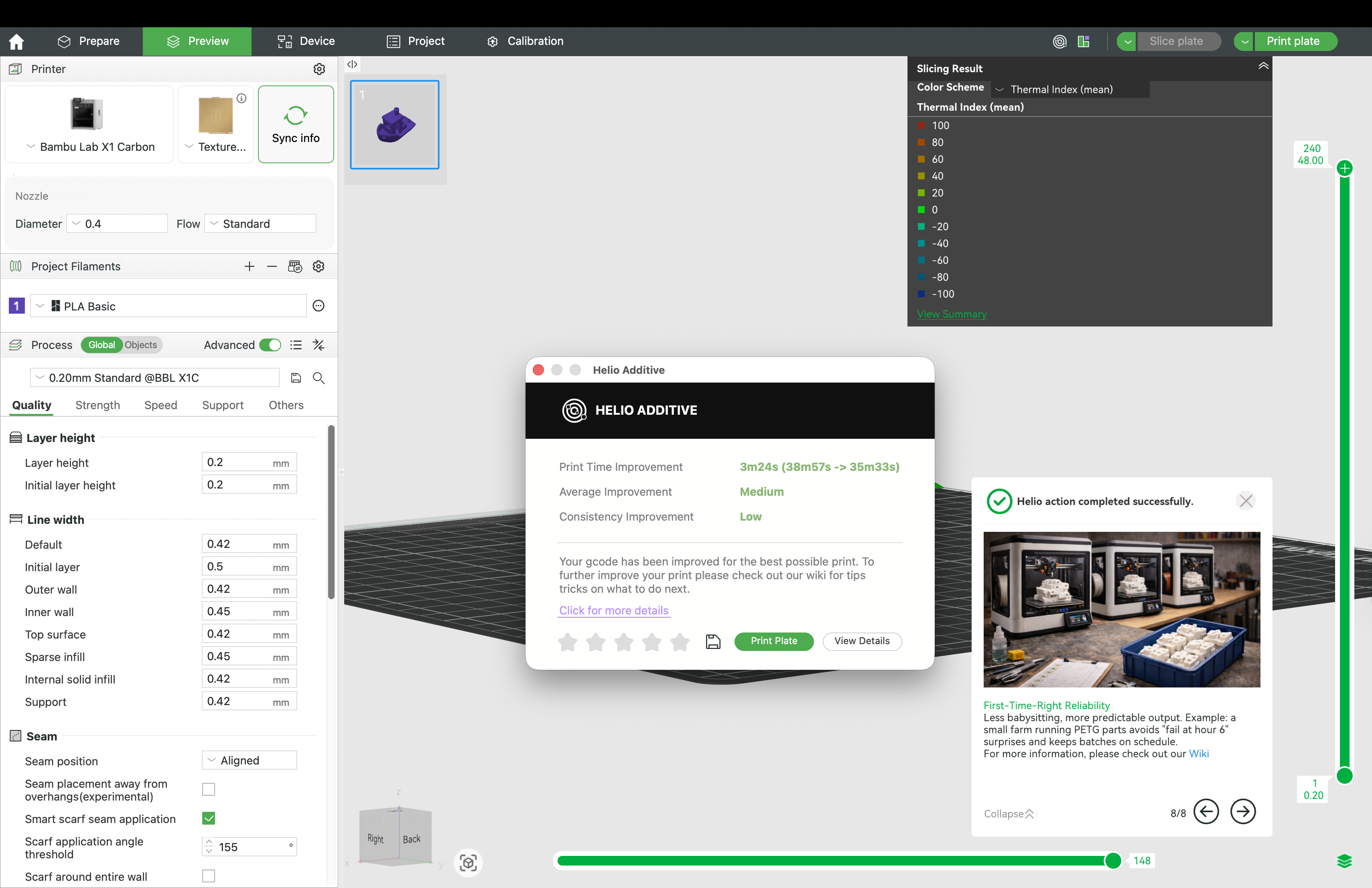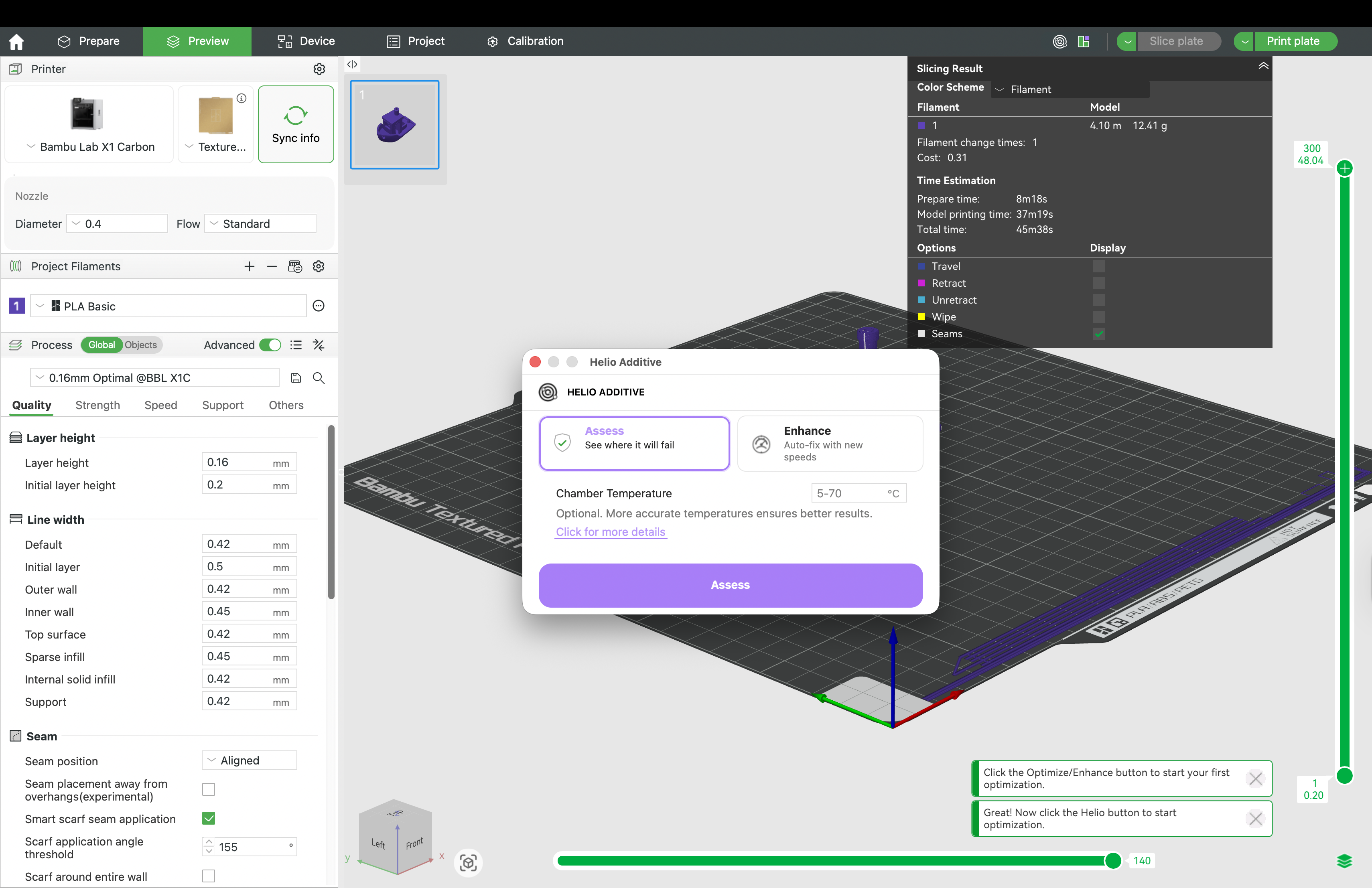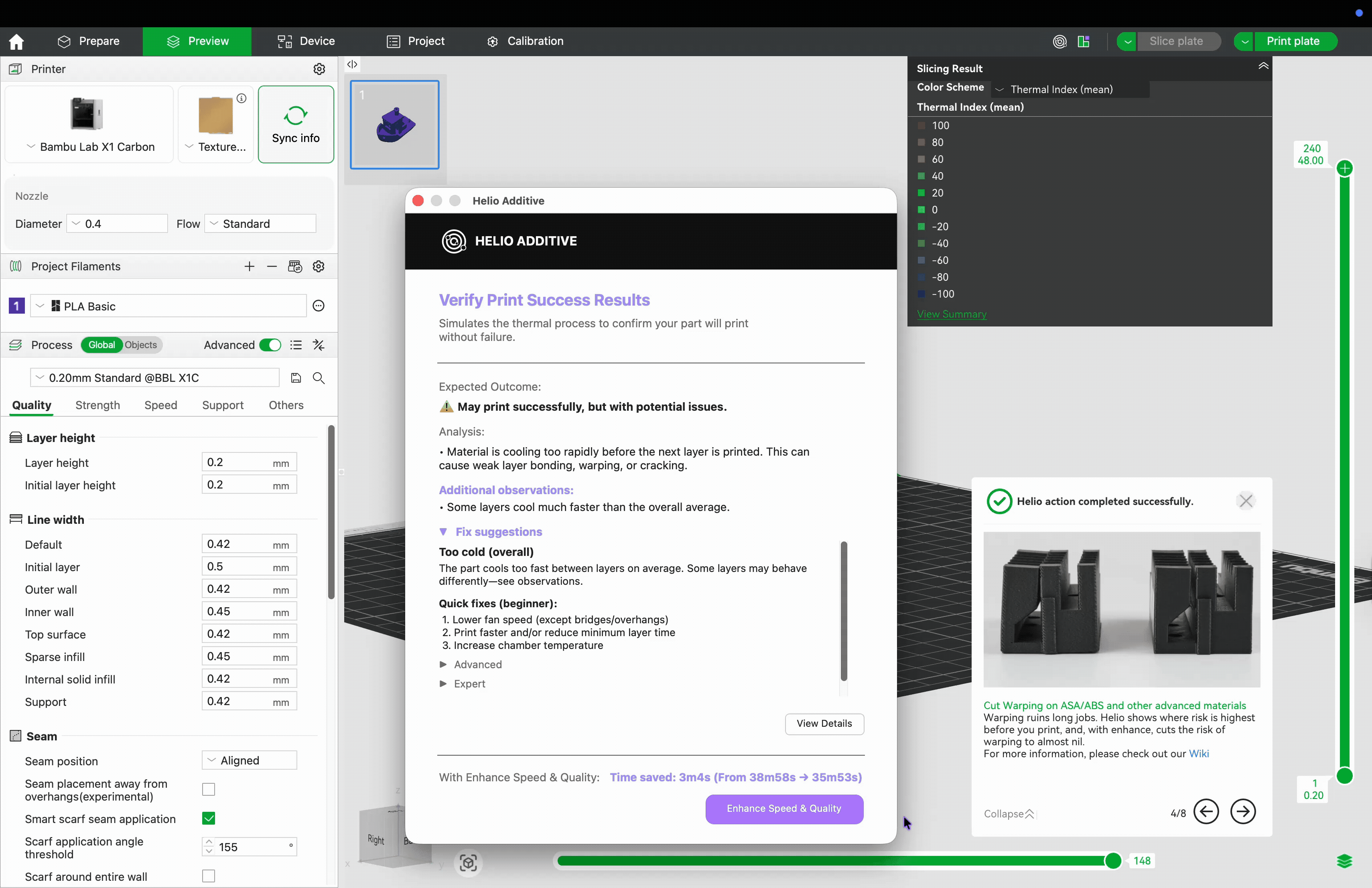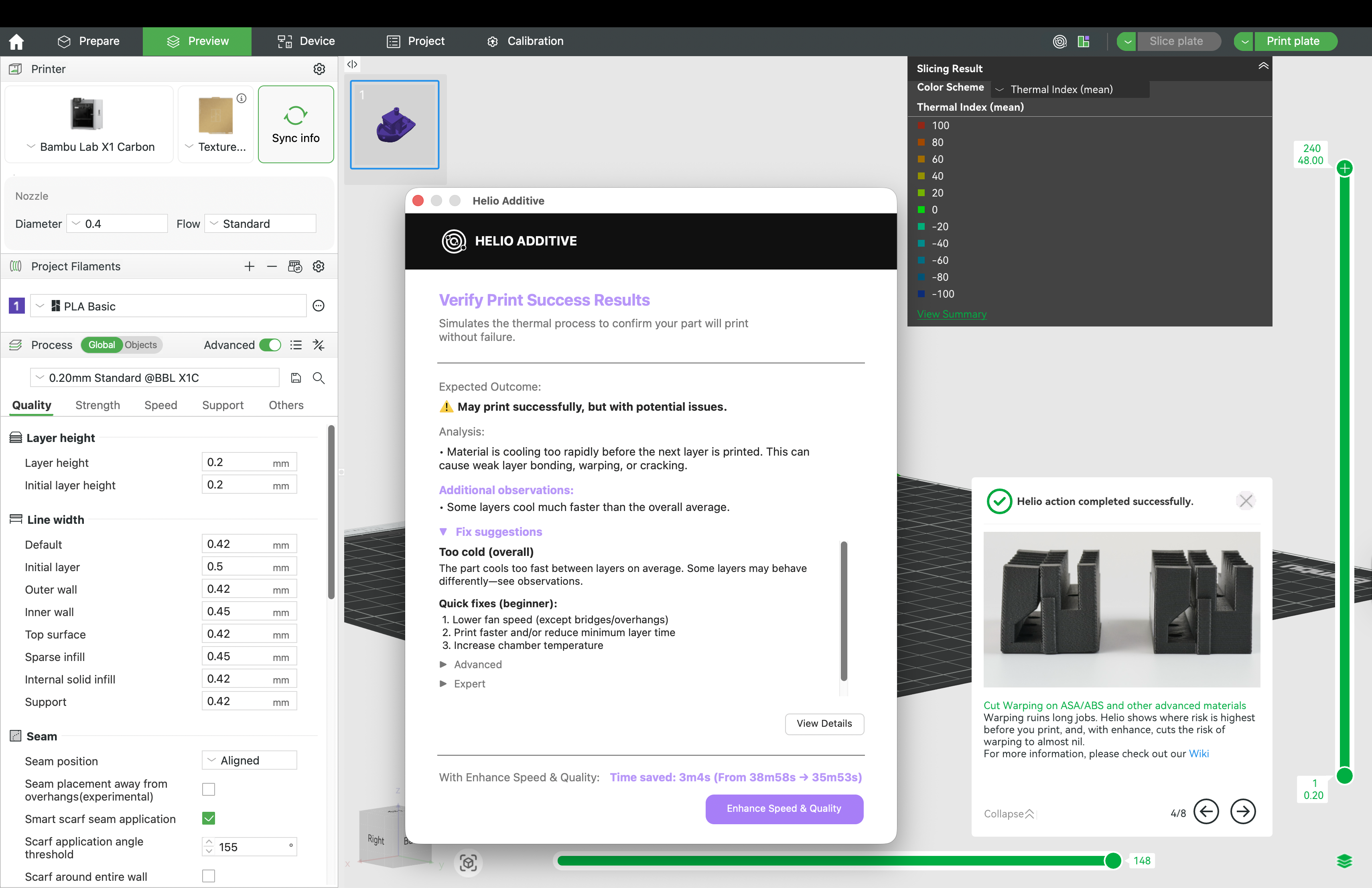 Helio’s Enhance service goes one step further than assess — it doesn’t just show you where prints may be too hot or too cold, it automatically adjusts layer times (via safe speed changes) to improve bonding, reduce warping, and often shorten print times.