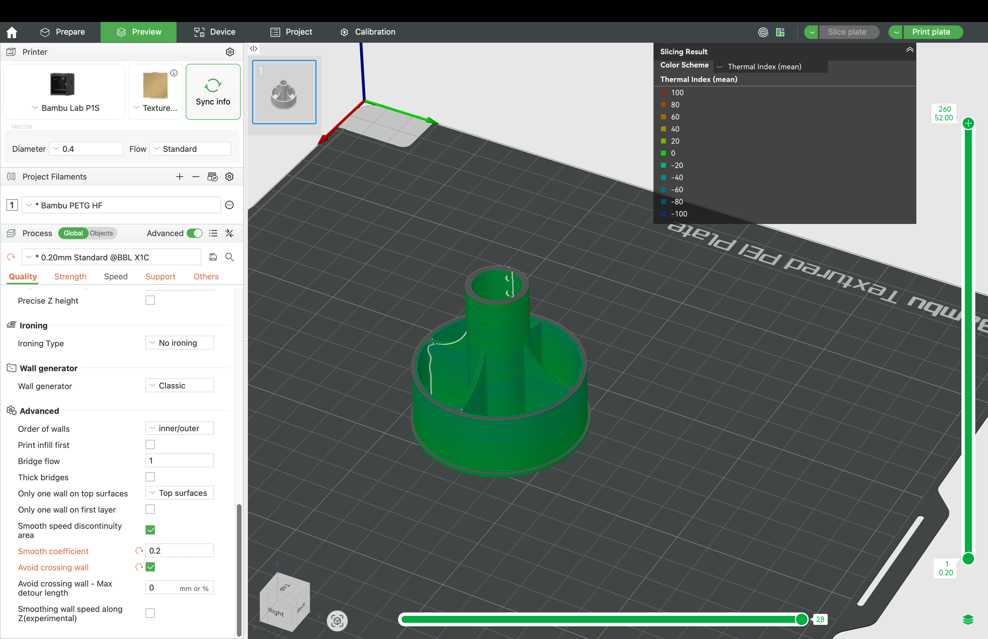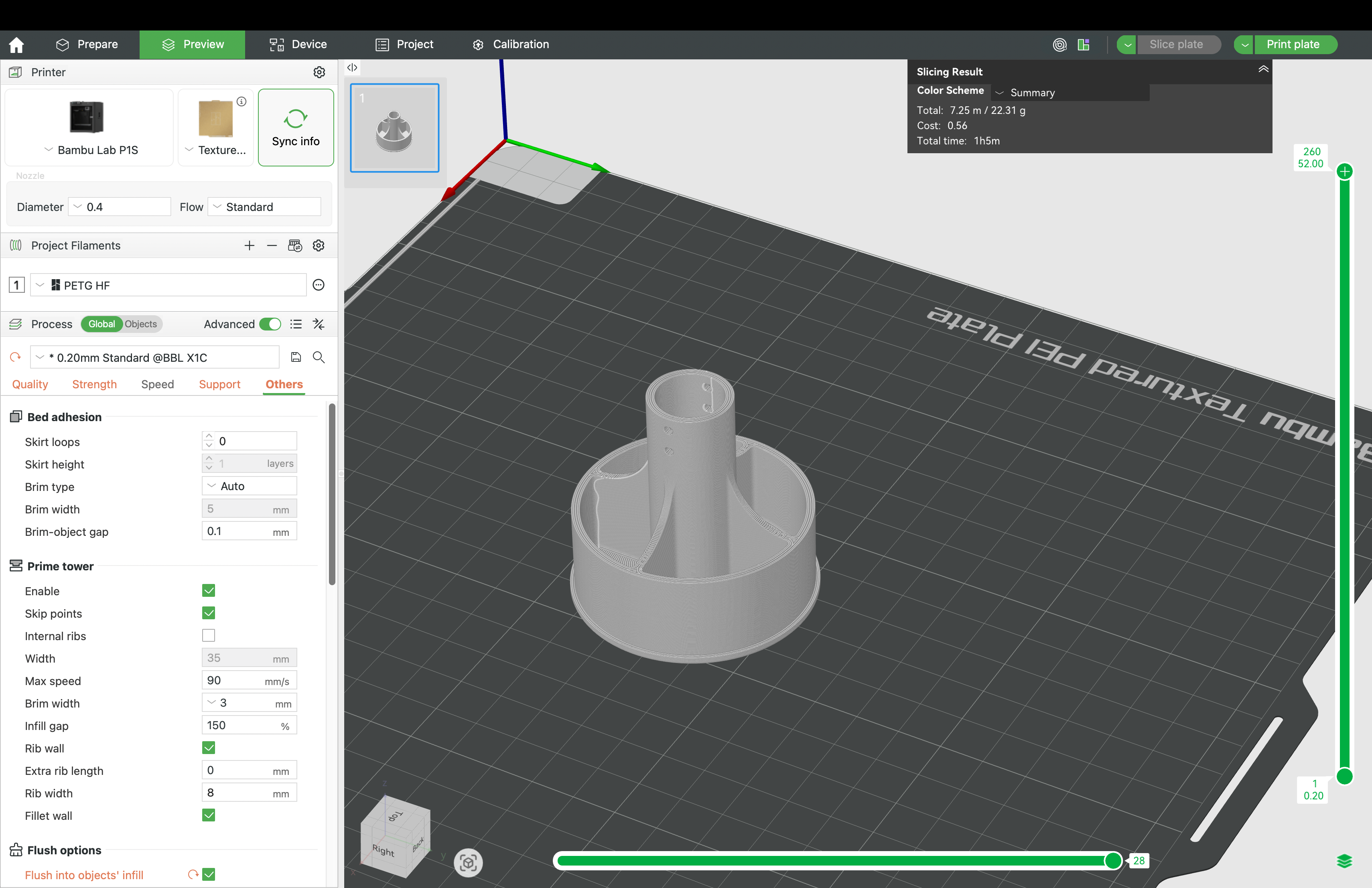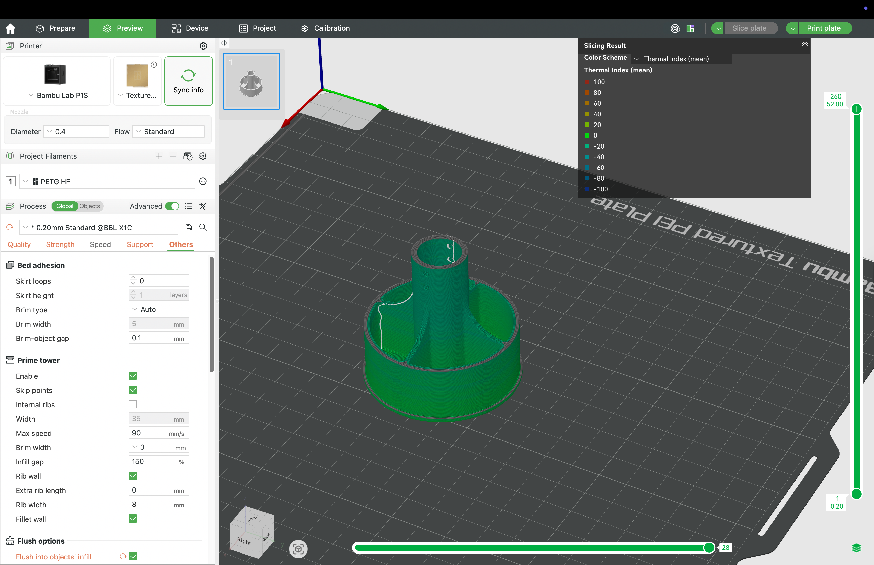 With the newly Helio-supported Bambu P1S, we tested how far we could push Bambu PETG-HF print performance on a functional lamp post fixture using Helio’s thermal simulation and optimization. Here’s what we achieved: